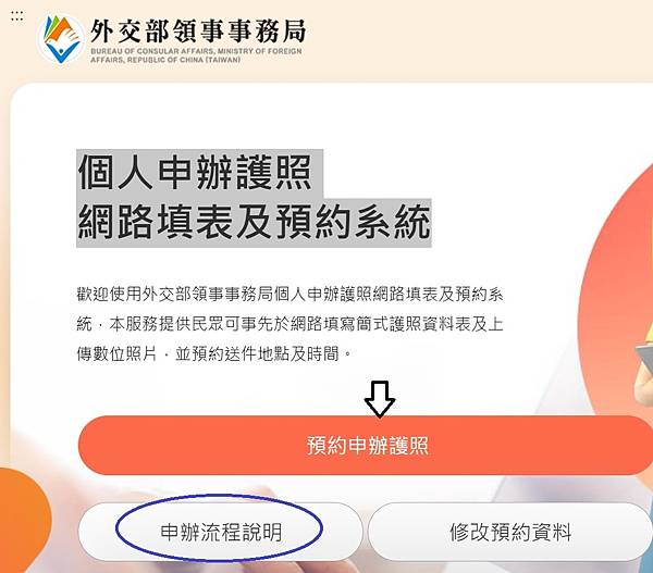 首先到外交部領事事務局的個人申辦護照網路填表及預約系統,閱讀完申辦流程說明之後,就可以點預約申辦護照。