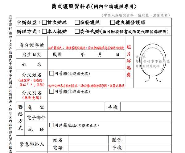 申辦護照可採網路預約填表 或 紙本填寫簡式護照資料表