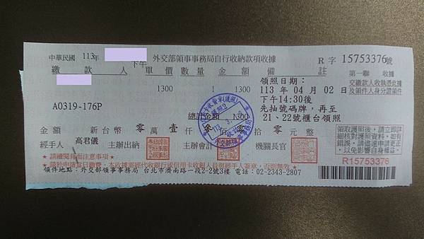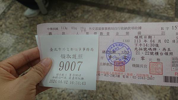 繳費後的收據上會蓋藍色戳印,也印有領件日期,領件日要帶身分證和收據來領護照。